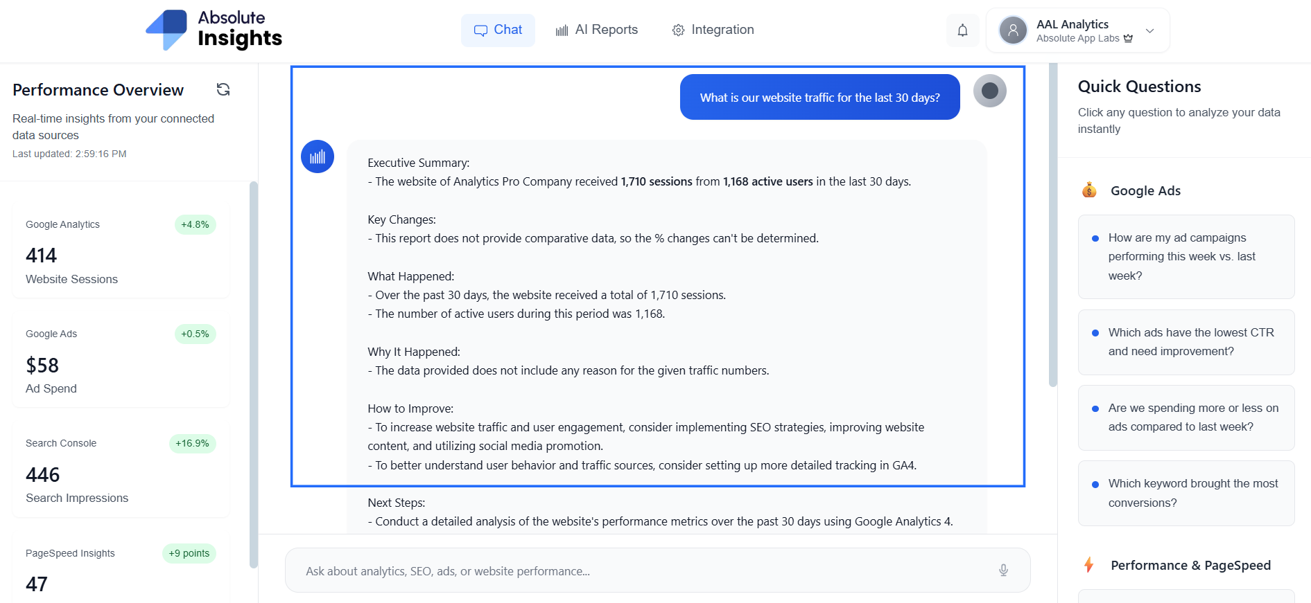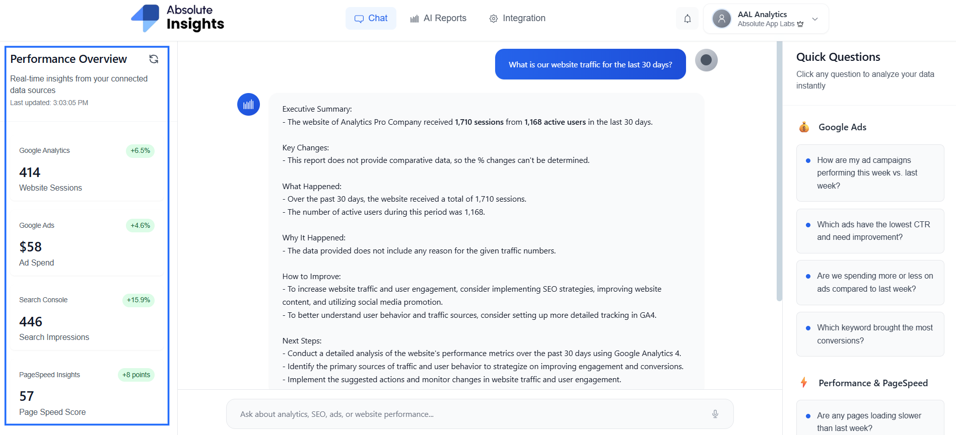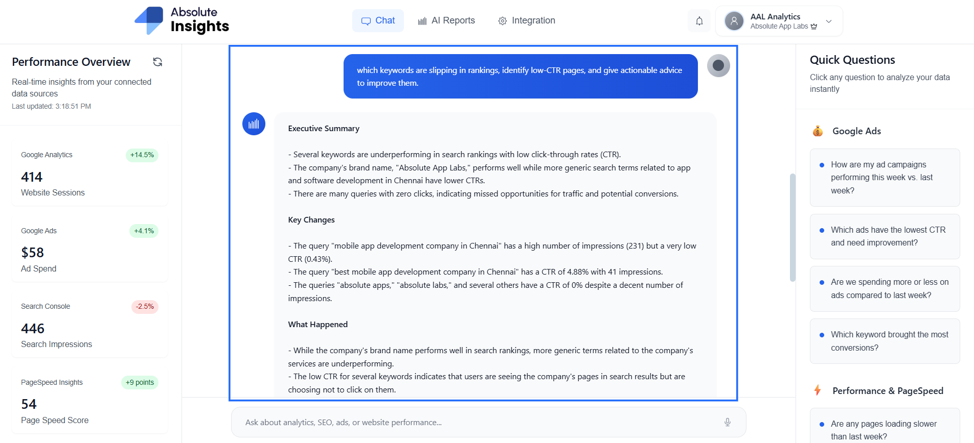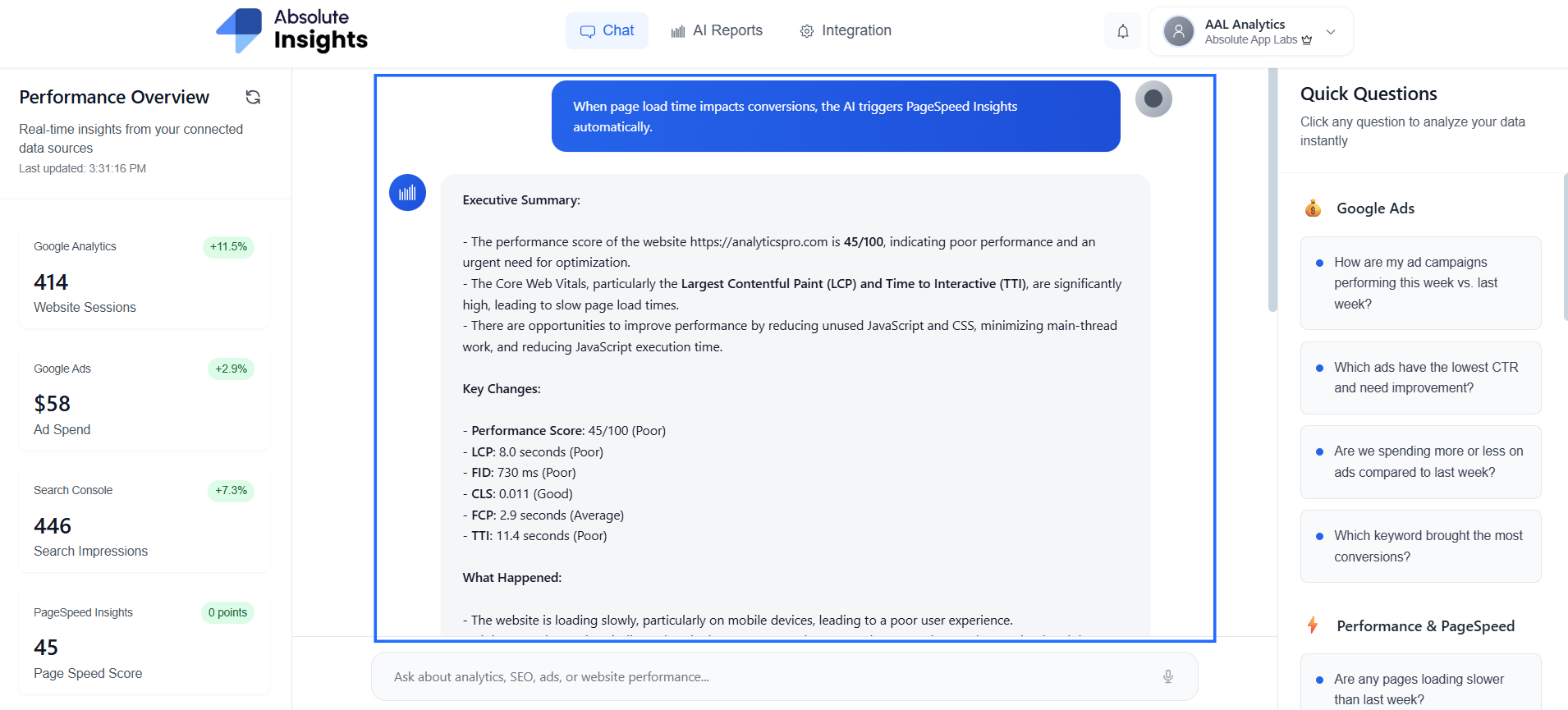 When page load time impacts conversions, the AI triggers PageSpeed Insights automatically.